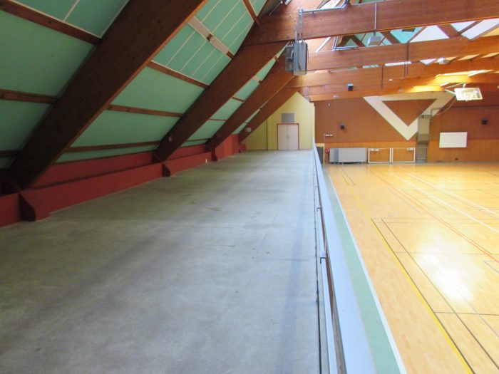 1 grande salle de 968 m², sanitaires, tables de 1,80 m de longueur, chaises, podium sur demande (hauteur ajustable - panneau de 1 m x 2 m), piste de danse sur demande (panneau de 1 m2 - maxi 150 m2), panneaux de séparation sur demande (hauteur : 2,20 m - largeur : 3 m), porte-manteaux (3 maximum).